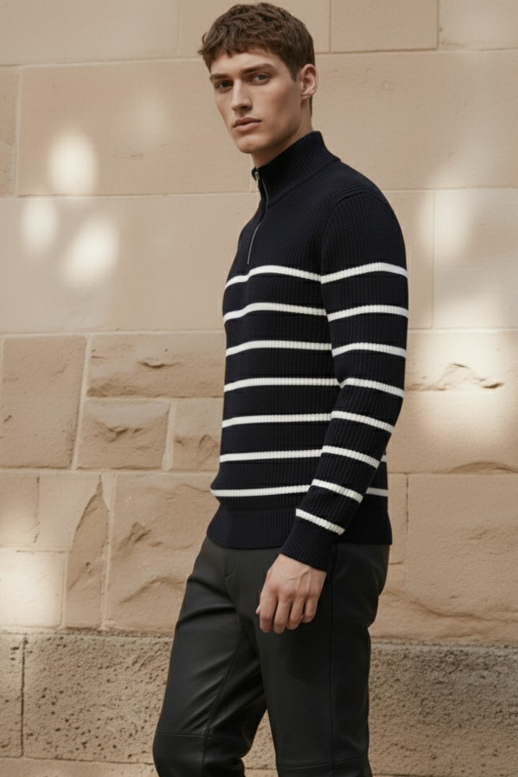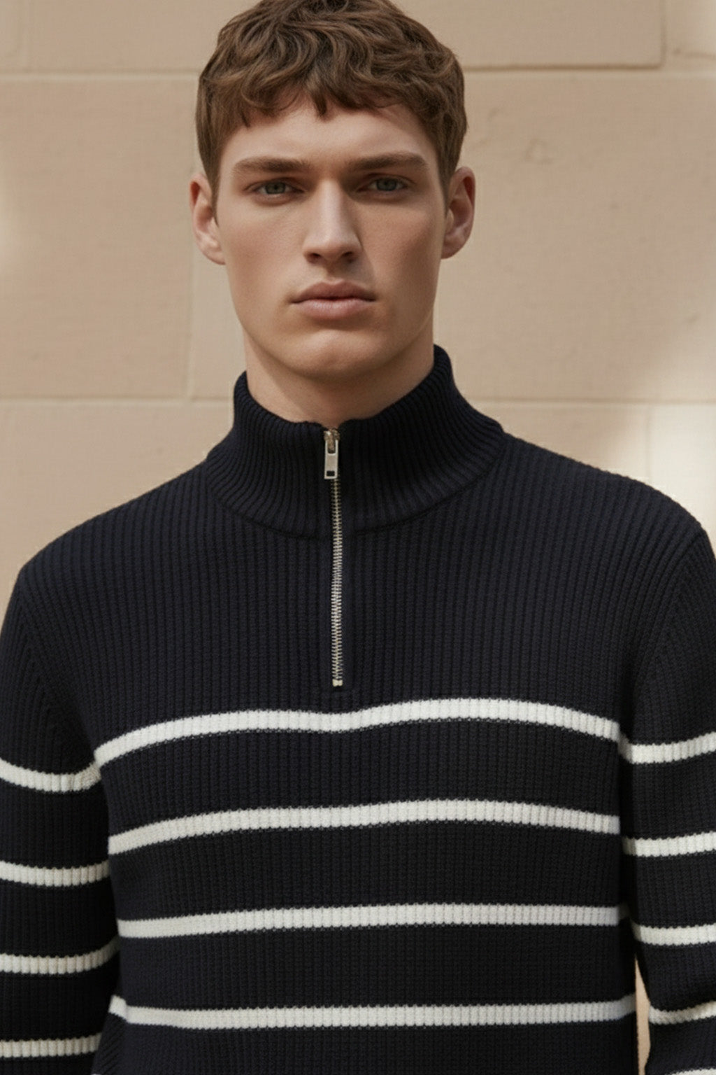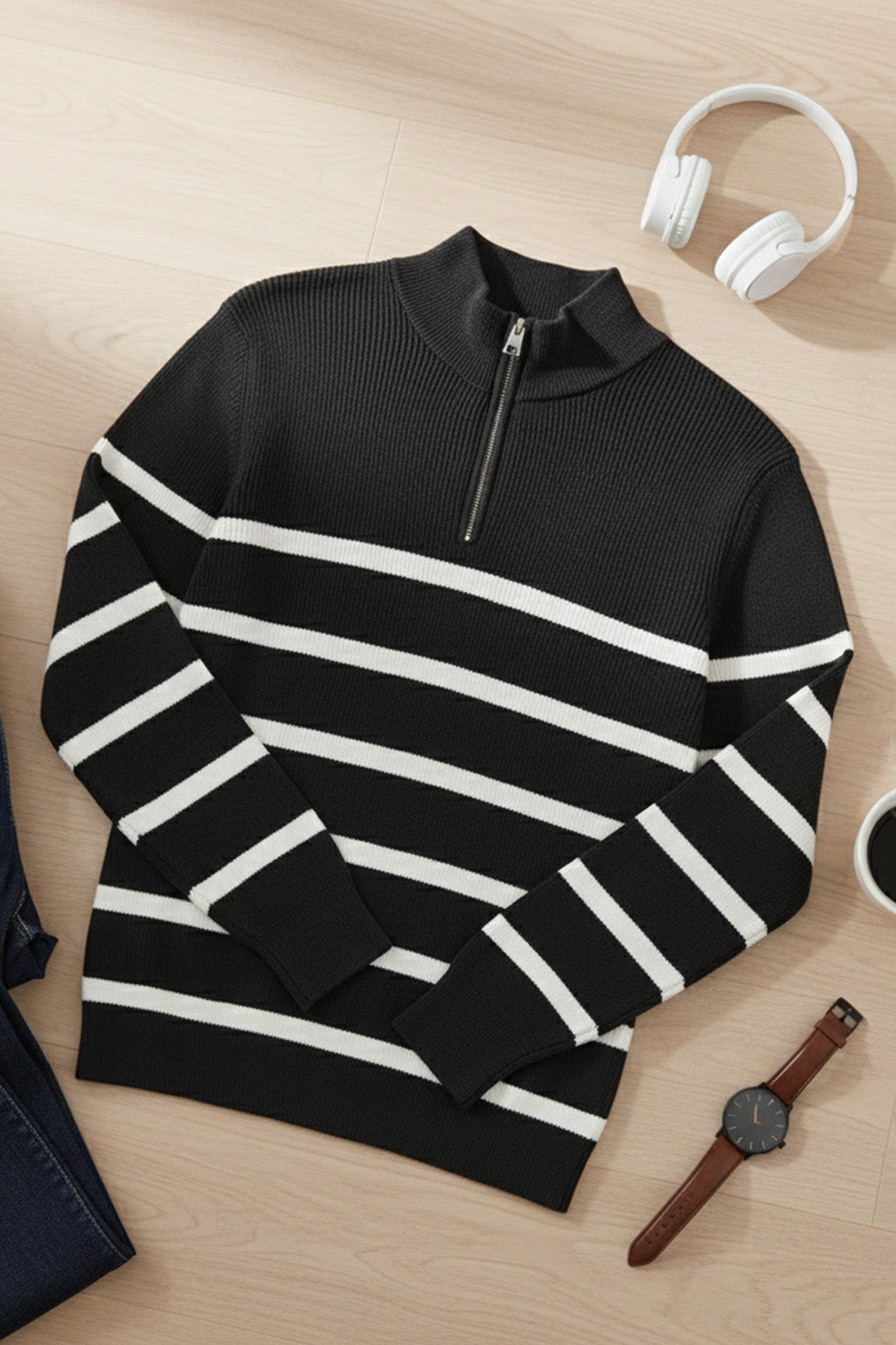 Wyrafinowany sweter o żebrowanej strukturze, zaprojektowany z myślą o komforcie i stylu. Wysoki kołnierz oraz pół-zamek nadają mu nowoczesnego charakteru, a czarne tło z białymi paskami tworzy ponadczasowy i wszechstronny wygląd. Idealny do noszenia samodzielnie lub jako warstwa w chłodniejsze dni.