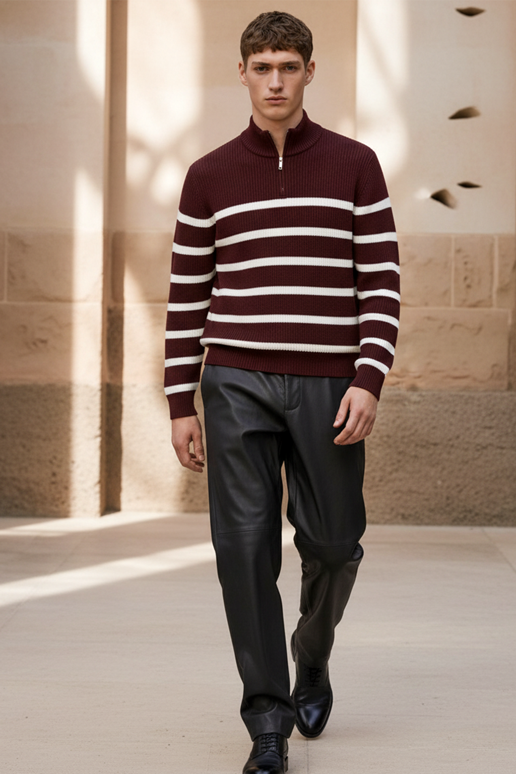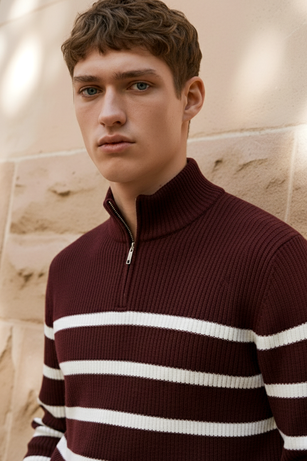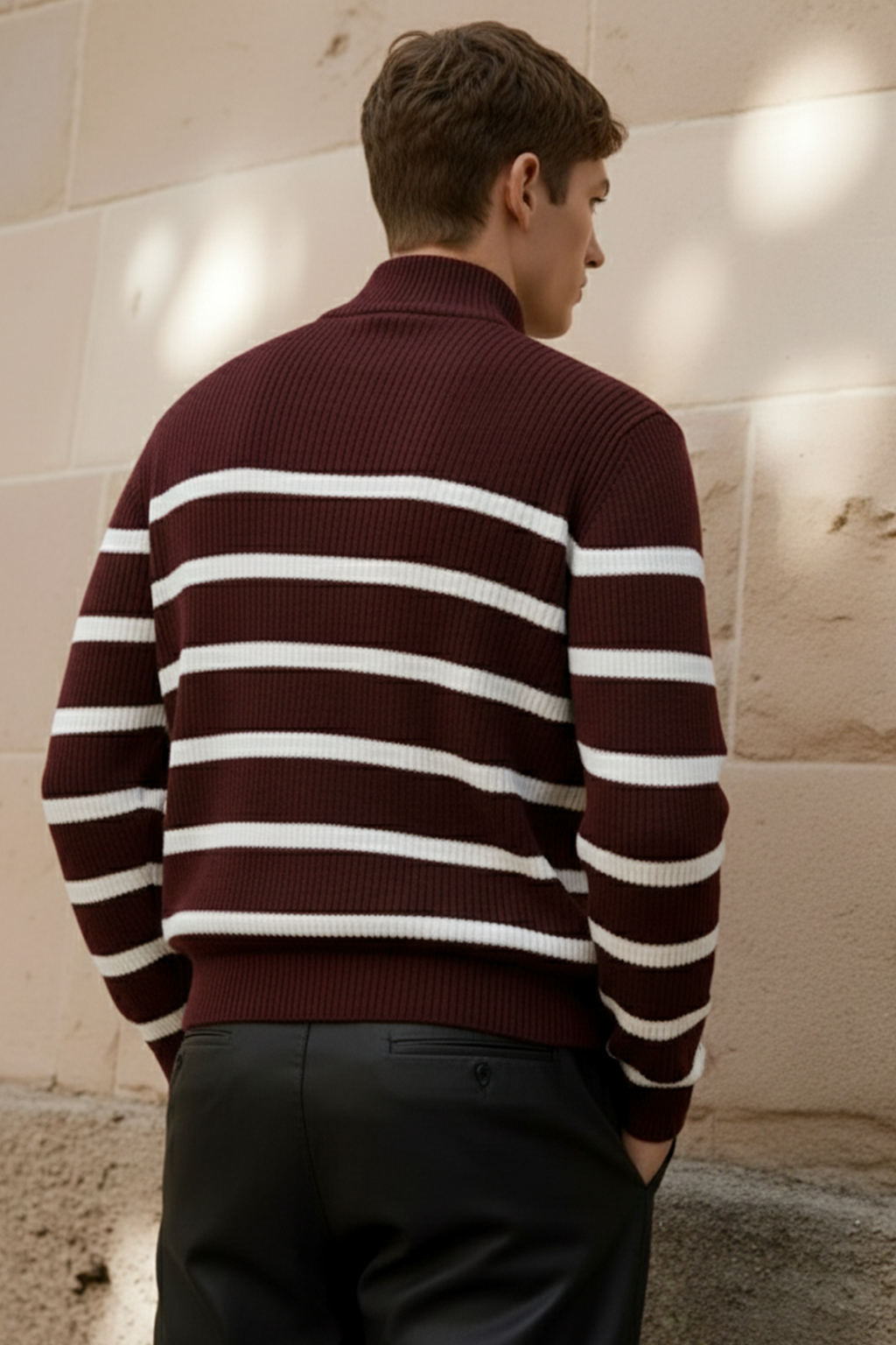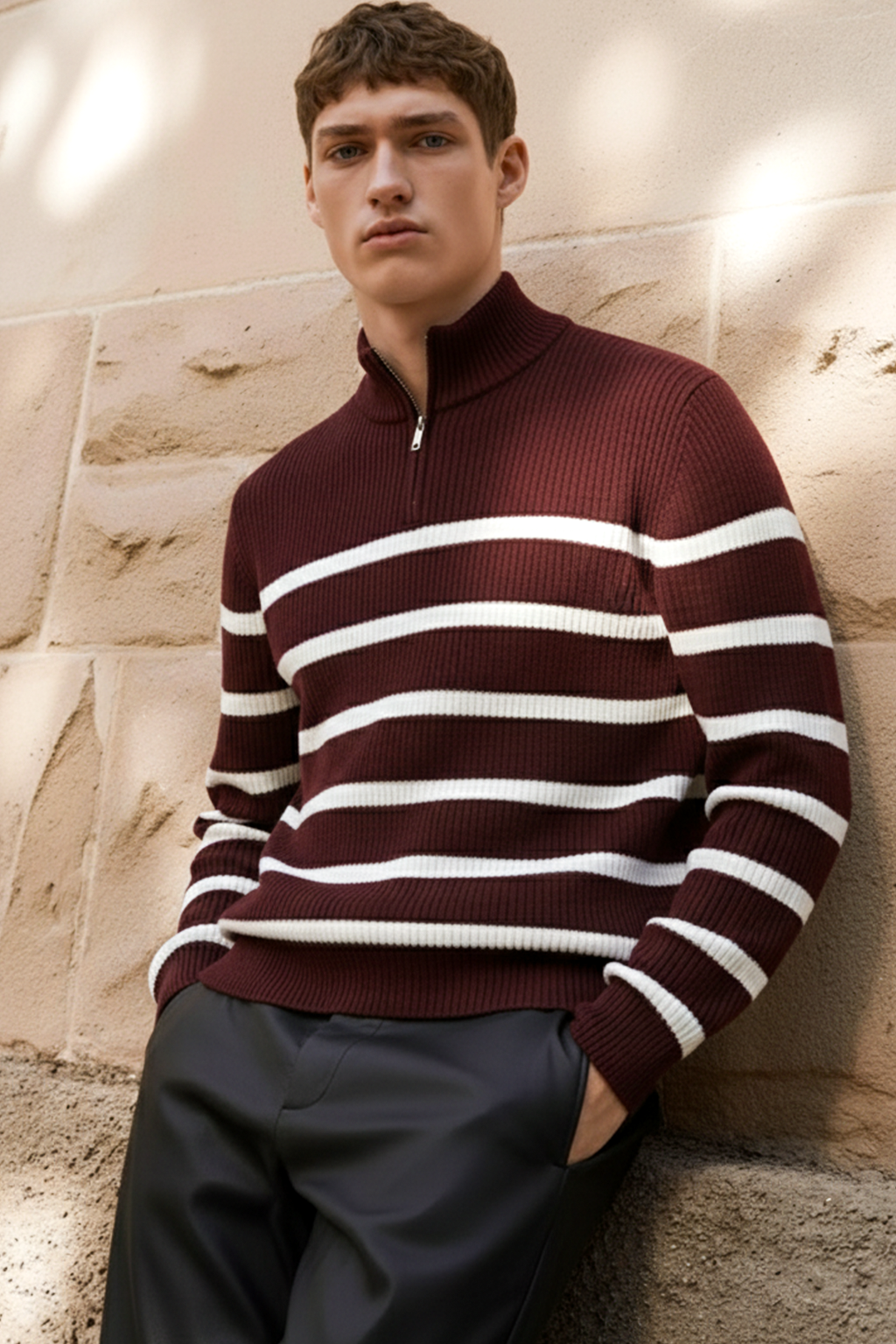Elegancki sweter w ciepłym odcieniu kasztanowego brązu, ozdobiony białymi paskami dla subtelnego kontrastu. Żebrowana struktura, wysoki kołnierz i pół-zamek nadają mu nowoczesnego, dopracowanego wyglądu. Ponadczasowy model, który łączy bogaty kolor z codzienną wygodą — idealny na chłodniejsze dni i warstwowe stylizacje.
