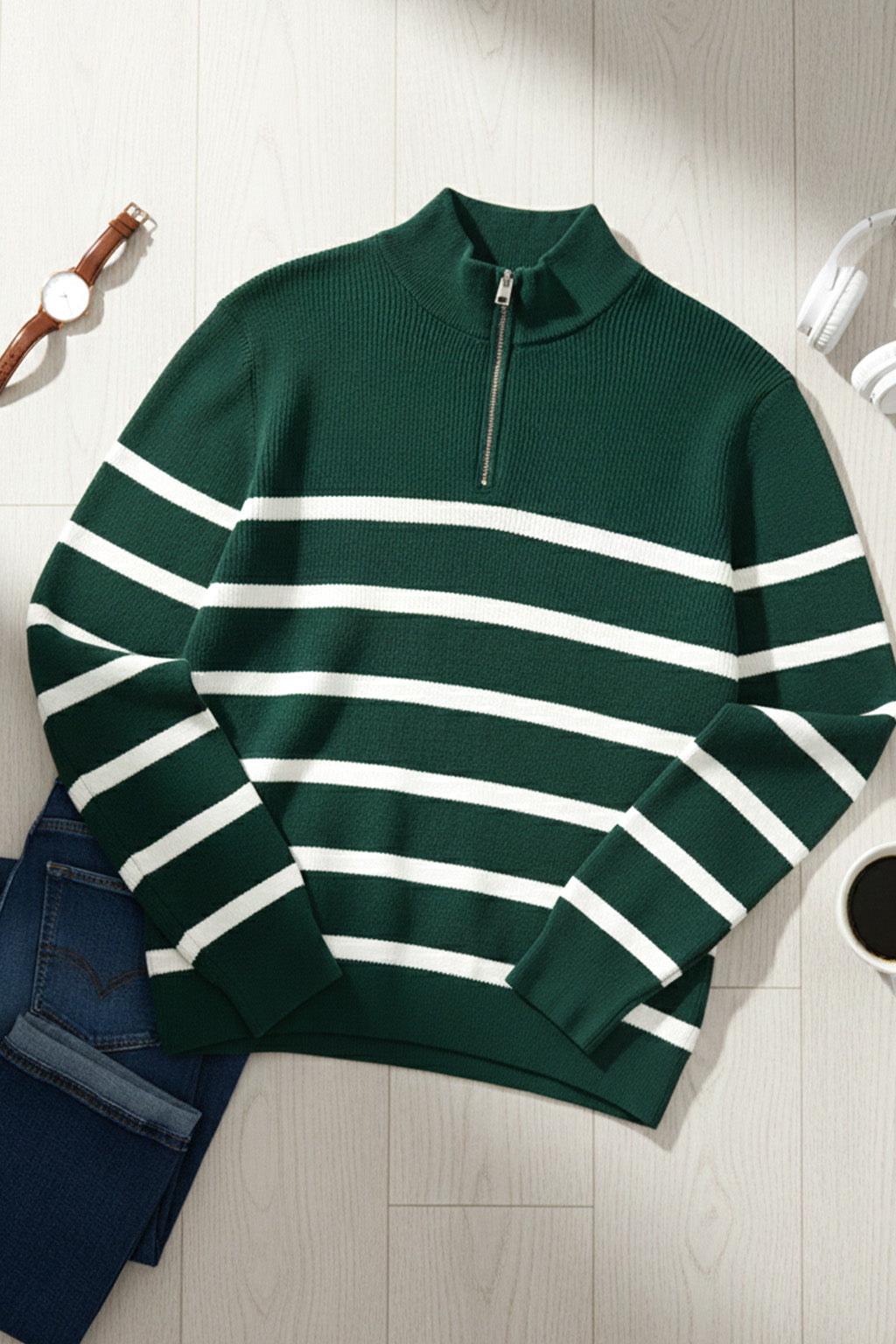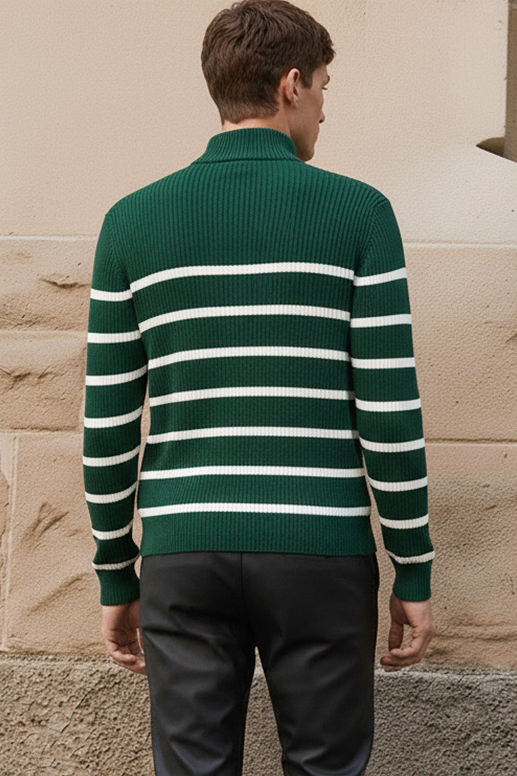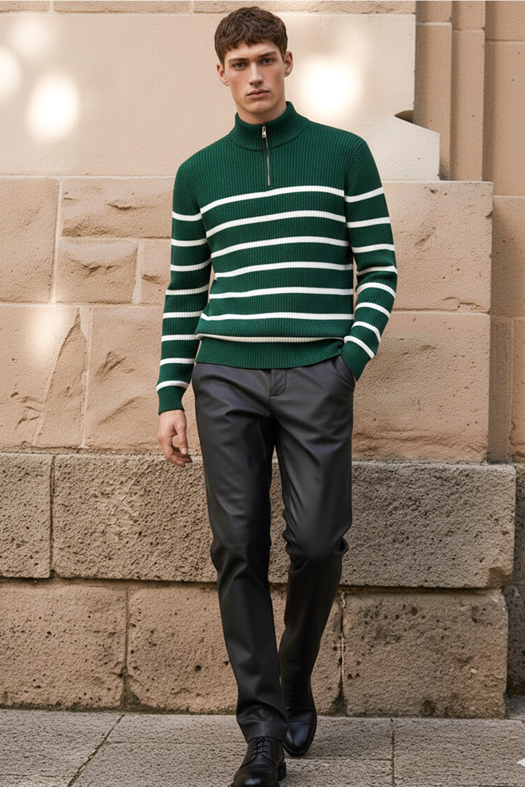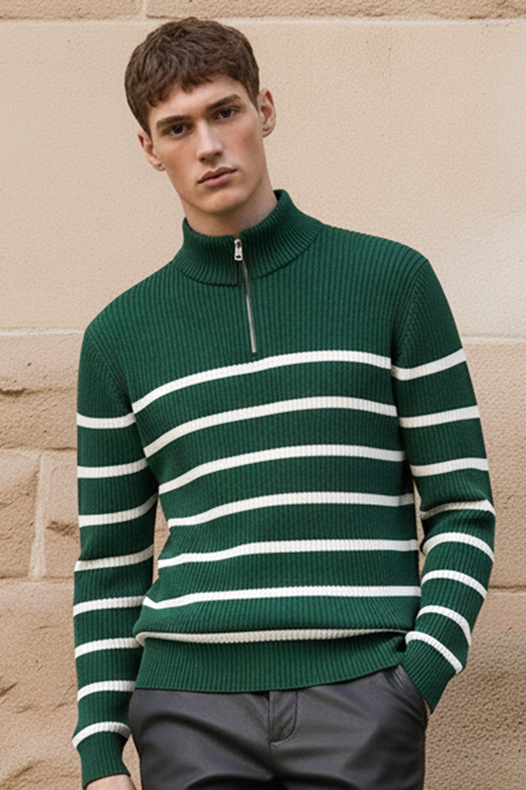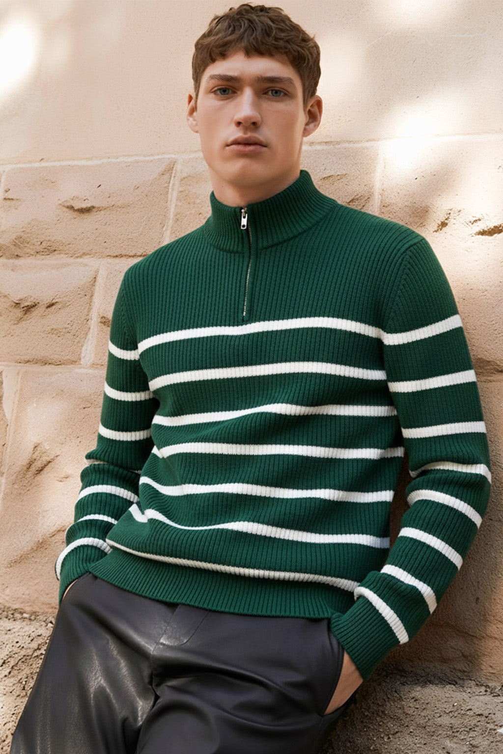 Sweter Damian w szmaragdowym odcieniu z białymi paskami to idealne połączenie wyrazistego koloru i nowoczesnego komfortu. Żebrowana struktura i pół-zamek przy kołnierzu nadają mu ponadczasowy, stylowy charakter na każdy dzień.
